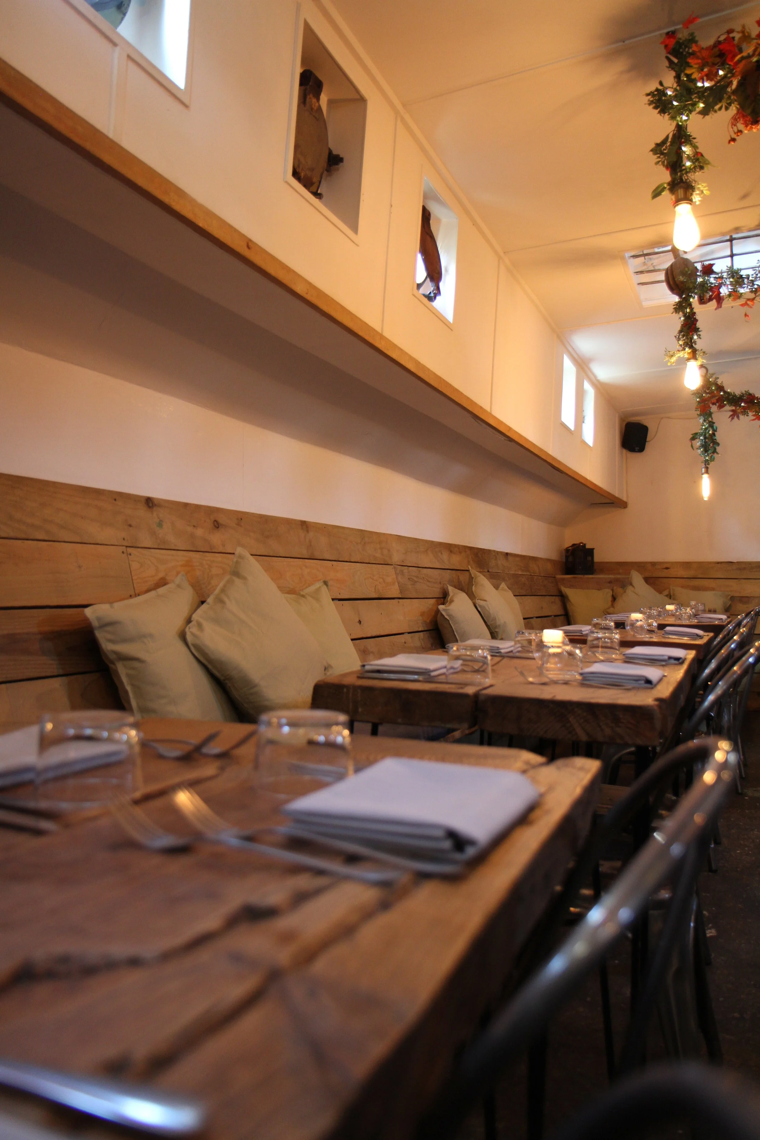 Our lower deck and main dining is one of the most unique dining spots in London, based in the lower quarters of our barge and doting a rustic yet warm and modern decor, all tables provide stunning views of our talented chefs cooking away in the galley.