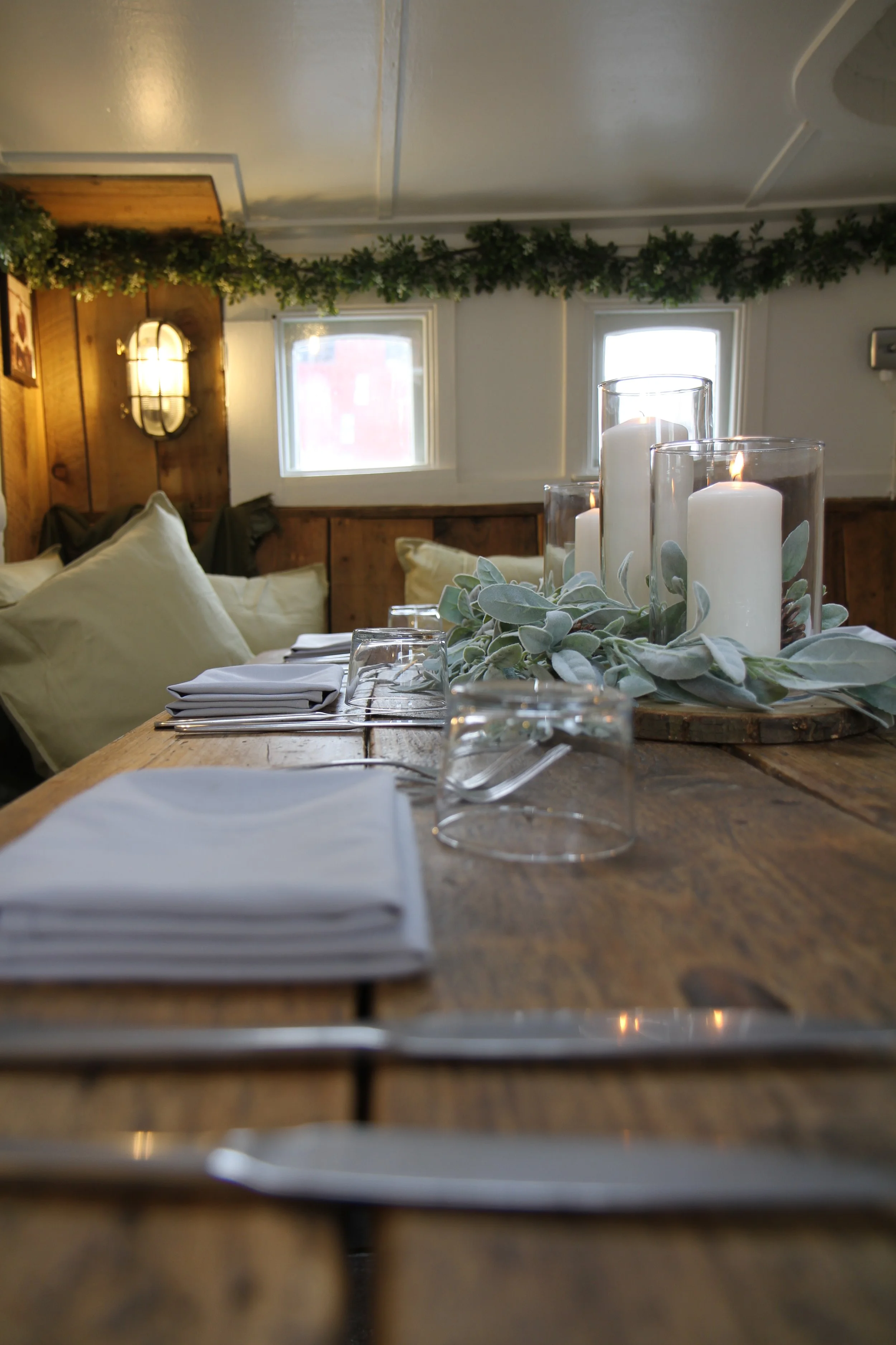 In-keeping with the barges historical grandeur, our restaurant dotes a rustic and restored decor with ambient lighting to set the tone and highlight a warm, comforting atmosphere.